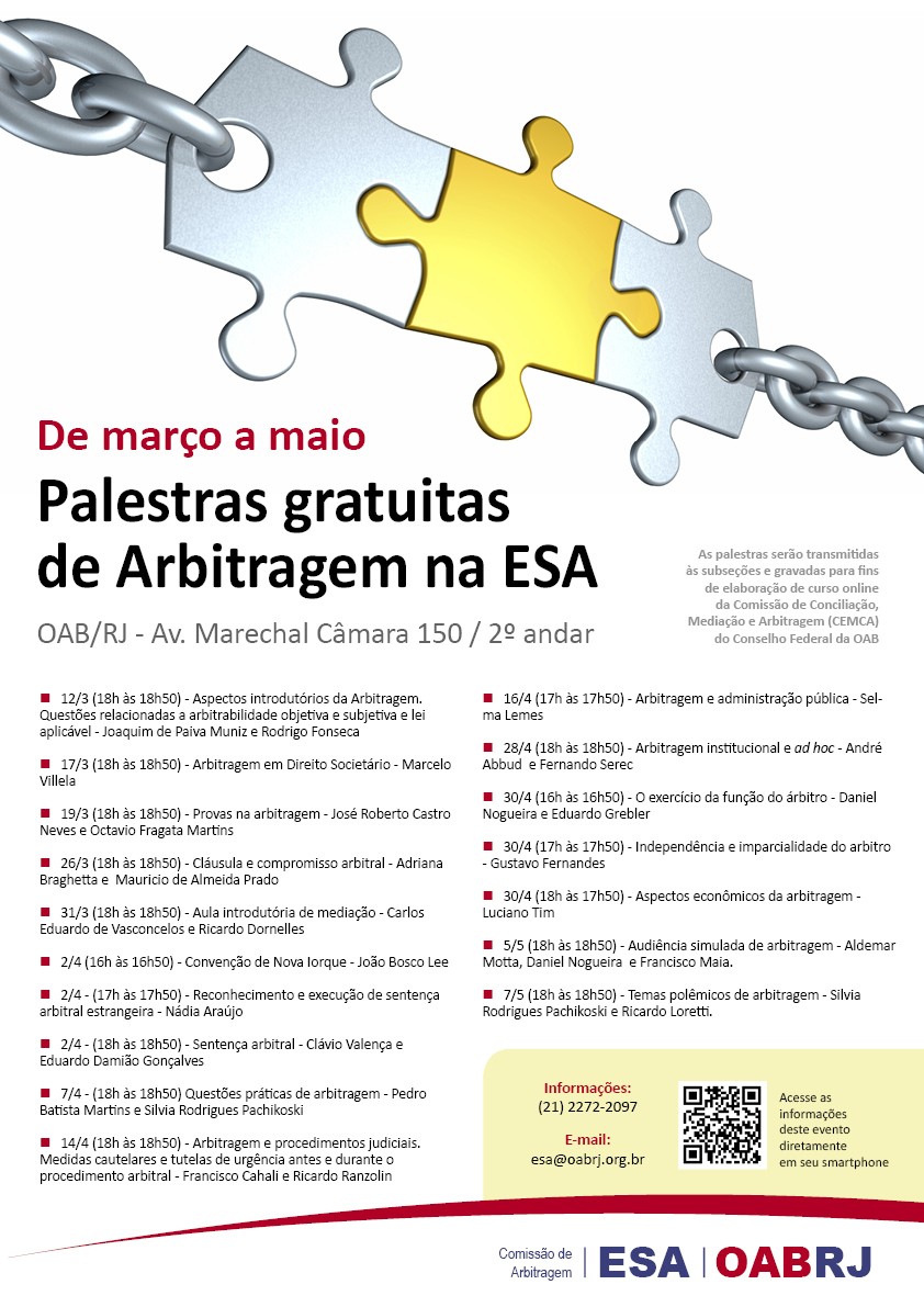 Começa hoje (12 de março) a realização de palestras gratuitas sobre Arbitragem na OAB RJ, a partir das 18 horas. As palestras de hoje versarão sobre aspectos introdutórios de arbitragem e serão proferidas pelos Drs. Joaquim Muniz e Rodrigo Fonseca.